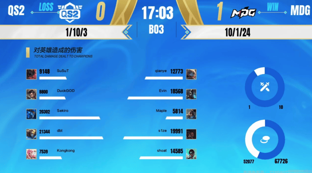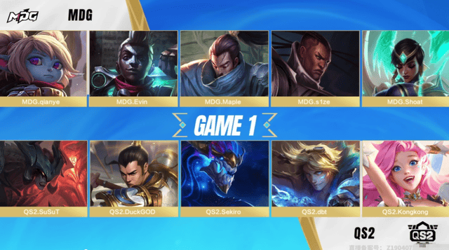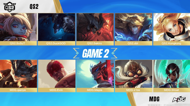 第一局比赛前期,双方打的都很保守,一直到5分30秒左右,MDG抓到了上路剑魔的机会,拿下了本场比赛的“一血”。拿下“一血”后,双方又是展开了一轮新的运营。一直到12分钟左右,双方才在中路爆发了5V5团战,这波团战,MDG成功打出了1换2。虽然从“人头”数来看,双方似乎还有的打,但是在经济上,MDG已经通过运营领先了许多。在之后的比赛中,MDG抱团推进,QS2虽然积极抵抗,但奈何差距过大。最终,MDG顺利拿下了第一局比赛的胜利。
