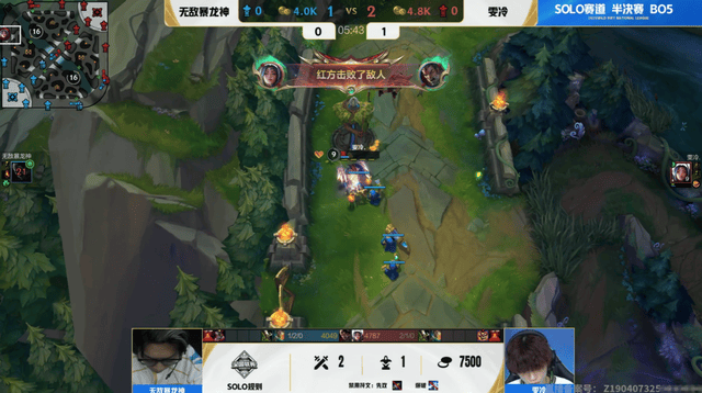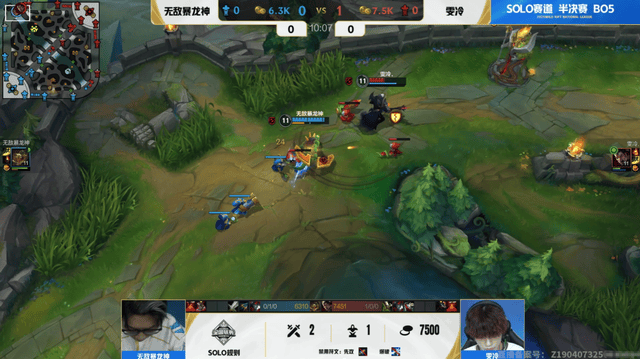 第二局比赛,无敌暴龙神选择了诺手,而雯冷则是拿出了自己的招牌英雄刀妹。与第一局比赛不同的是,这局比赛双方来到2级的时候就有一波打到底的对决,虽然雯冷的刀妹成功越塔“击杀”了无敌暴龙神的诺手,但也因此被防御塔“击杀”,双方打出了一换一的操作。雯冷的刀妹不愧是他的招牌,在随后的对决中,雯冷依靠着兵线与刀妹的灵活,成功消耗了无敌暴龙神诺手的血量,在5分30秒左右,雯冷更是凭借着操作再次完成越塔“击杀”。虽然雯冷的刀妹再次被防御塔“击杀”,但率先拿到两个“人头”的他已经是赢下了这局比赛的胜利。