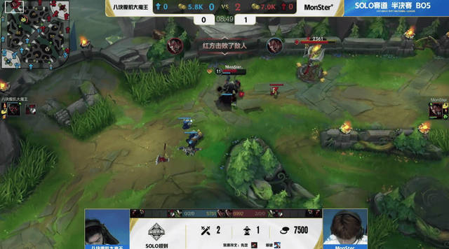 第二局比赛,MonSter°选择了诺手,八块腹肌大魔王同样选择了诺手。诺手与诺手的较量,自然大家都想先拿下“一血”并滚起雪球。所以,双方从一开始就火药味十足,见面就是一套连招。这样的情况一直持续到了比赛时间5分钟左右,率先挂上被动的MonSter°取得了先机,更是完成了“单杀”。而这一次“击杀”,明显是改变了场上的局面。虽然八块腹肌大魔王想努力靠经济追上去,但奈何MonSter°的基本功同样不错。最后,眼见追赶经济无望,八块大腹肌选择硬拼,但经济的差距始终存在。MonSter°再次获得“击杀”并拿到了赛点。