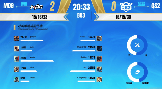 这局比赛的“一血”是诞生在4分钟左右,依靠着打野及时的增援,QS2在双人路的较量中打出了1换2。不过,就像第一局类似,在运营方面,明显还是MDG更加出色。即便在后续的几波团战中,MDG在“人头”上并没有占到便宜,但凭借着出色的运营,MDG依旧是把经济慢慢拉开。这样的情况一直持续到了比赛19分钟左右,因为始终无法拉开经济,QS2选择放手一搏,偷打大龙。但可惜的是,还是被MDG发现,MDG更是打出了一波2换4的团战并拿下了大龙。最后,QS2大势已去,MDG直接以2-0的总比分成功击败QS2并率先挺进决赛!