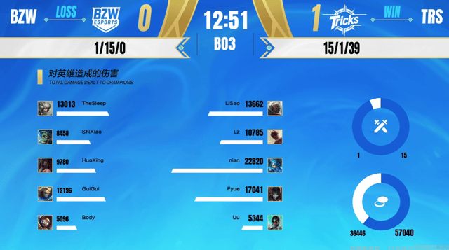 比赛开始没多久,双方就在野区与中路几乎同时爆发“人头”。不过,TRS的辅助卡尔玛游走明显更加积极,虽然自家盲僧并没有完成“单杀”,甚至被阿木木靠着防御塔“反杀”,但卡尔玛依旧是收下了阿木木这个“人头”。在这之后,或许BZW自己也没有想到,这个会是自己这一场比赛唯一的“人头”。因为在后续的比赛中,TRS的抓机会能力以及团战能力明显更强。最终,凭借着15-1的巨大优势,TRS可以说是非常轻松地击败了BZW,拿下了第一局比赛的胜利。